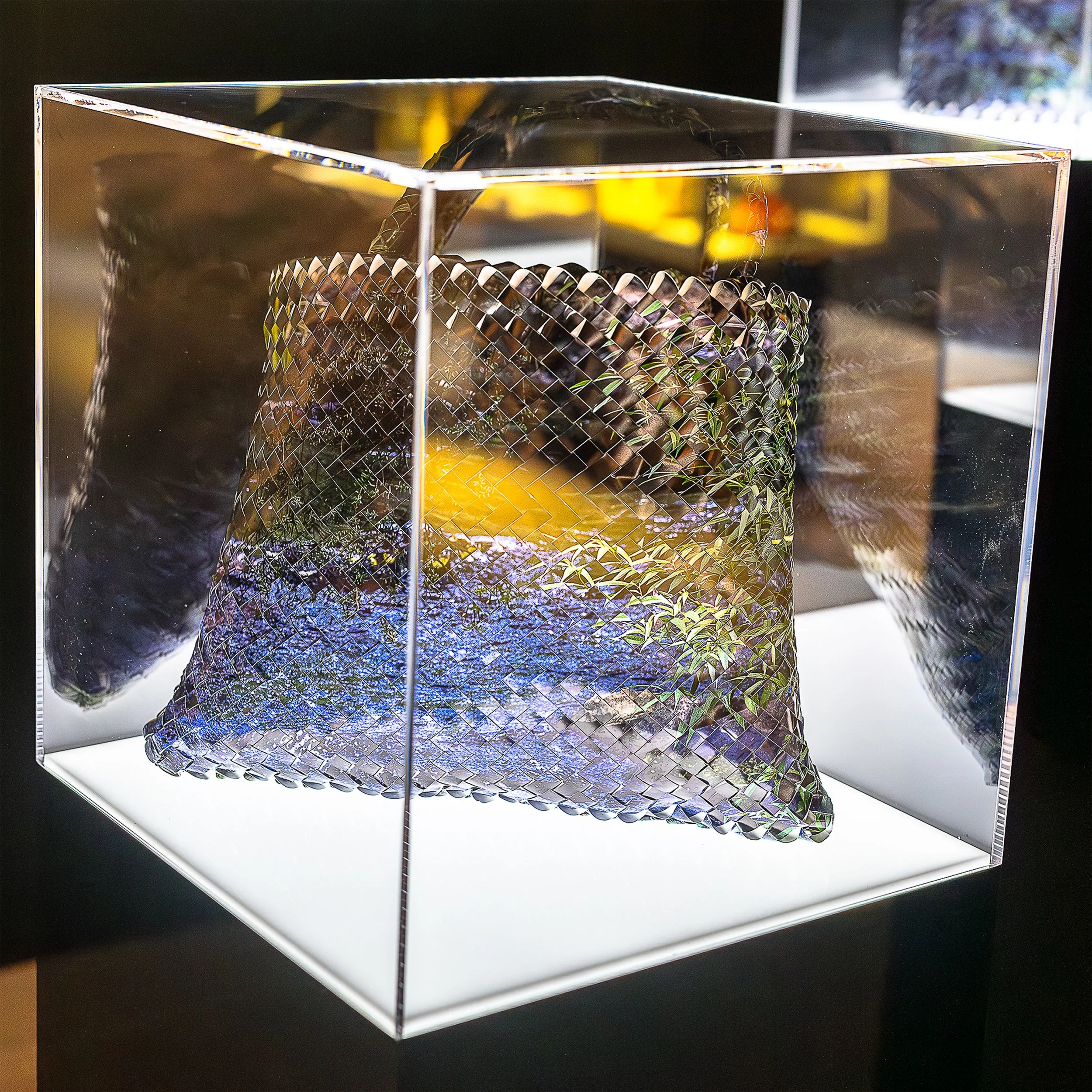 Te repo (the Wetlands), (2025), Handwoven photographic Māori kete (carrying basket), image Kirsten Garner Lyttle