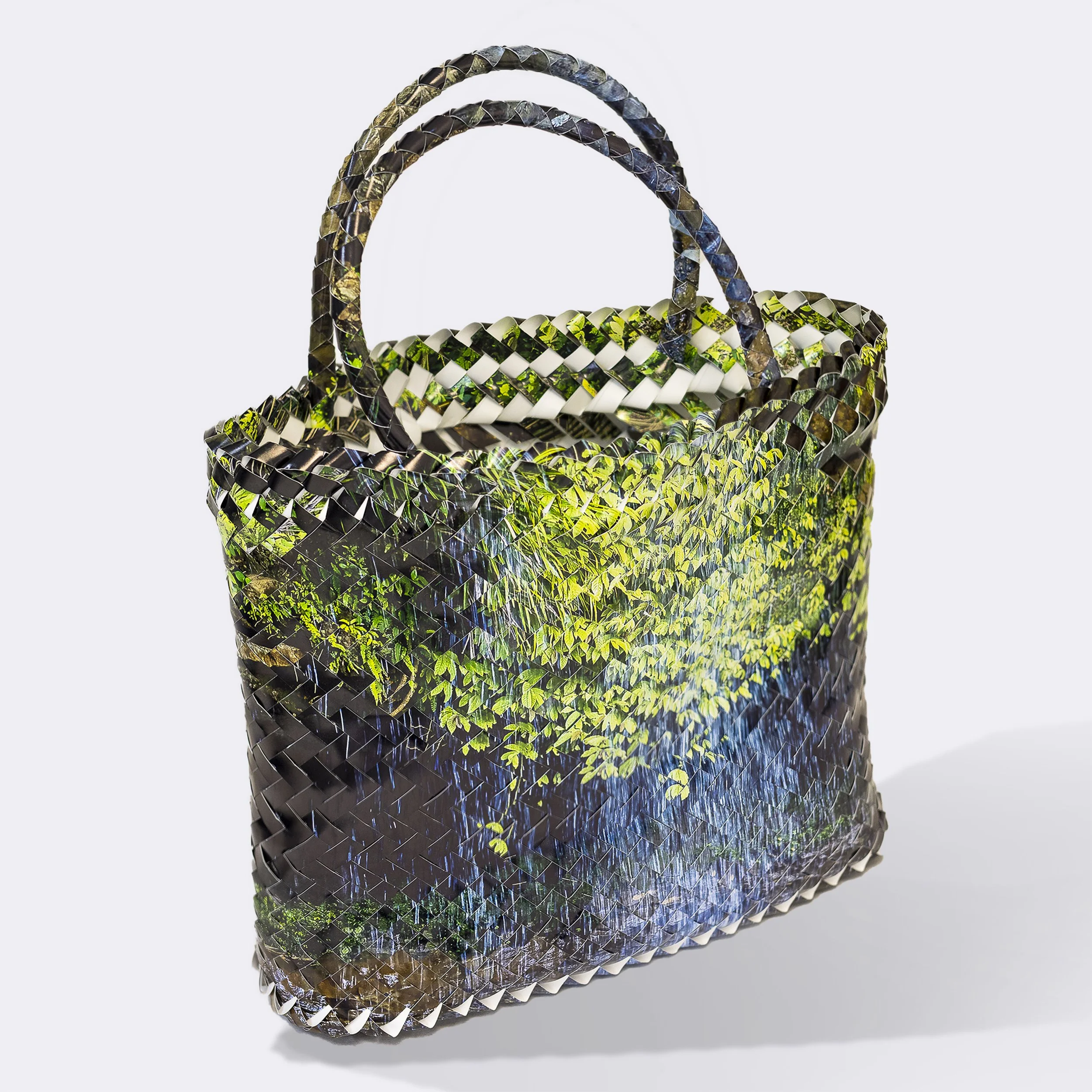 Waikaretuu Waterfall (2025), Handwoven photographic Māori kete (carrying basket), image Kirsten Garner Lyttle 2025.