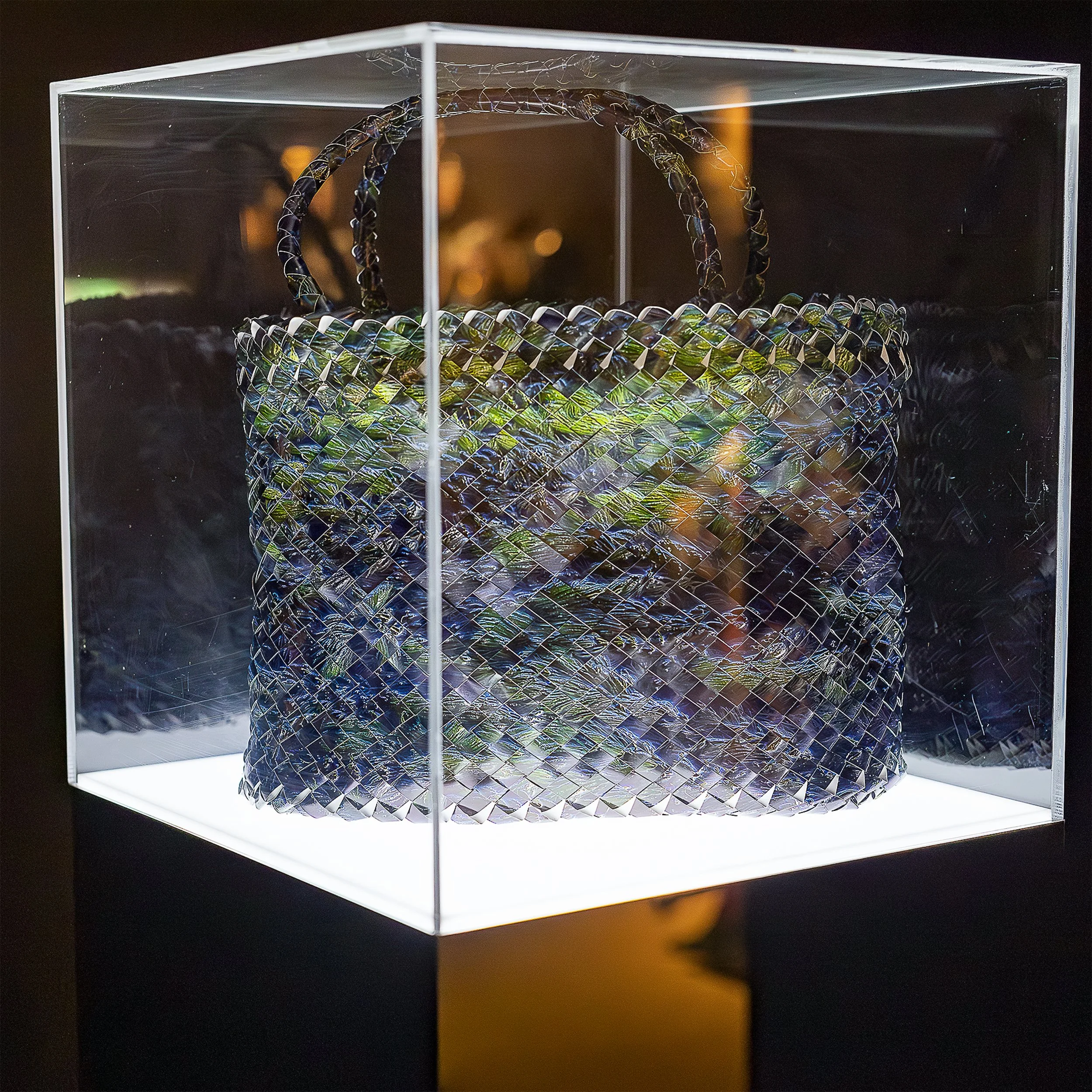 Waikaretuu Taniwha, (2025), Handwoven photographic Māori kete (carrying basket), image Kirsten Garner Lyttle 2025.